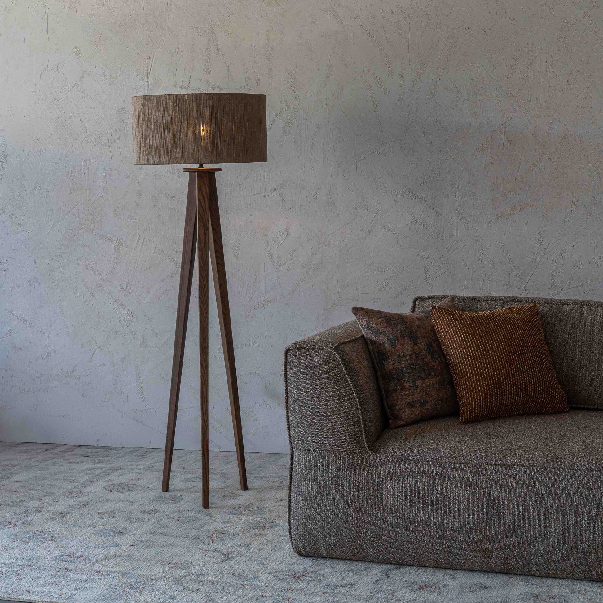 Shop the Lunar Tripod Floor Lamp in Dubai. Solid wood base with a jute shade. Perfect for luxury interiors. Available now at WS Living Furniture Dubai.