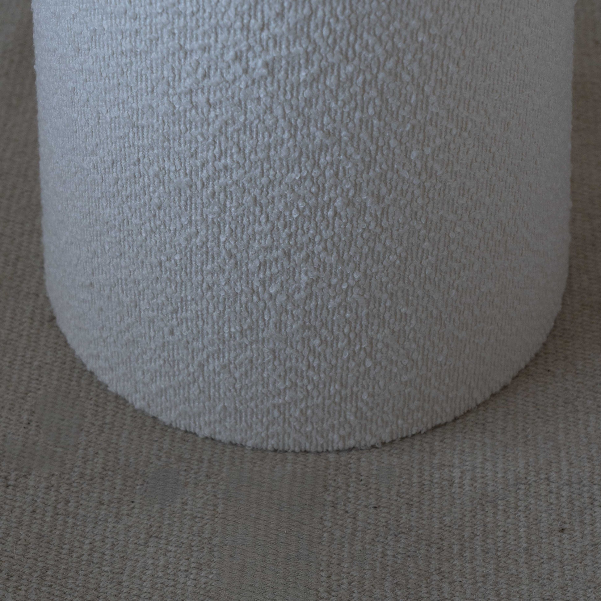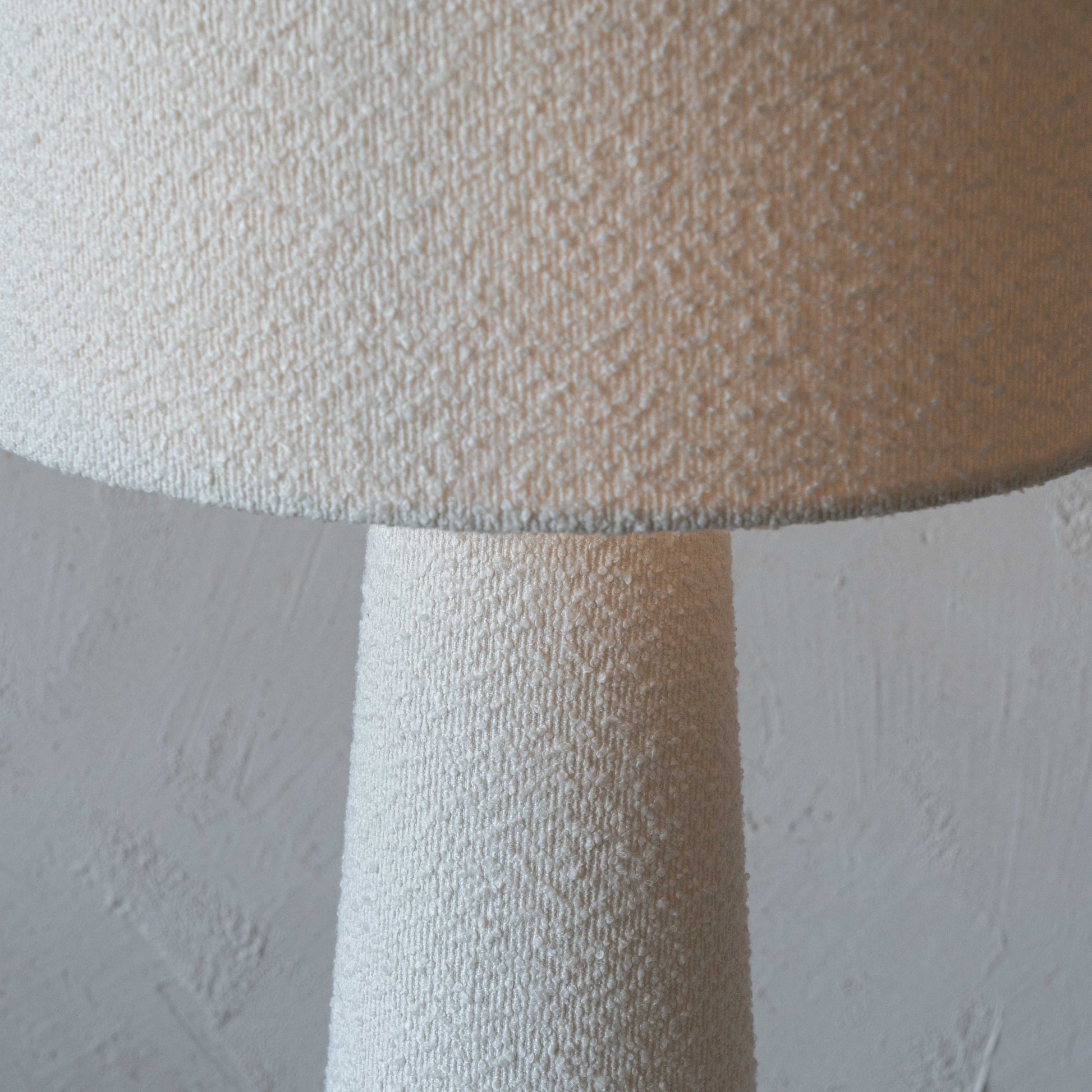 Pollux White Boucle Floor Lamp features a sleek design with white boucle fabric throughout. This modern lamp offers a minimalist yet stylish touch to any room.