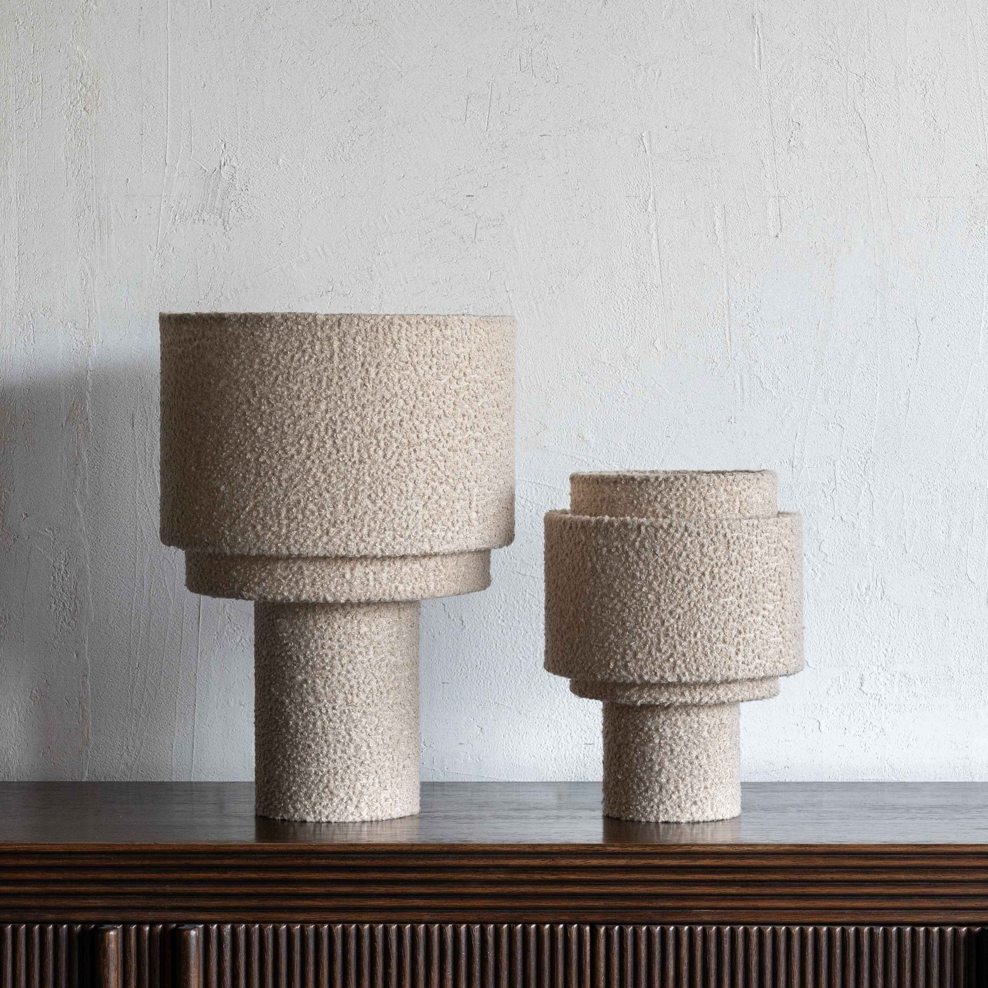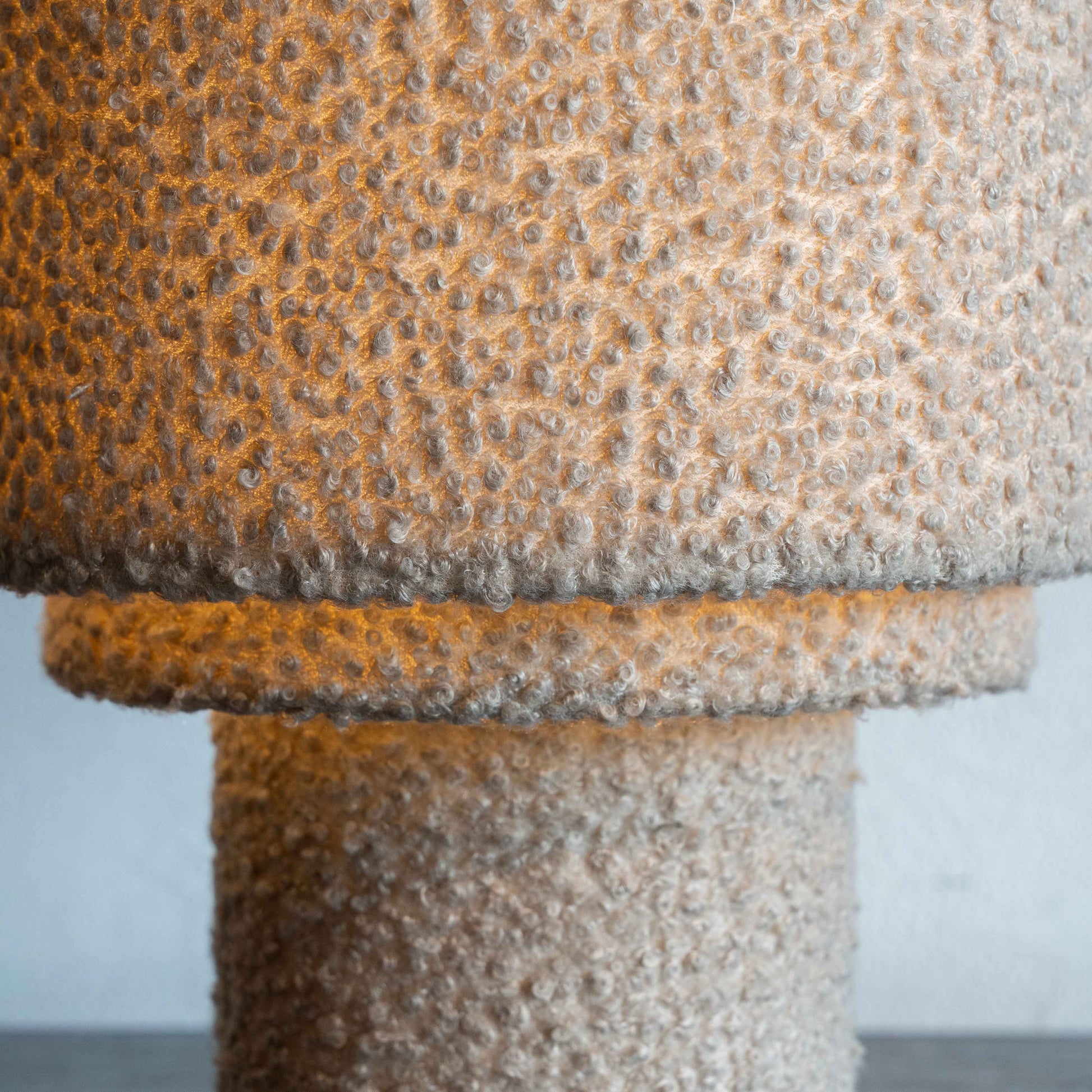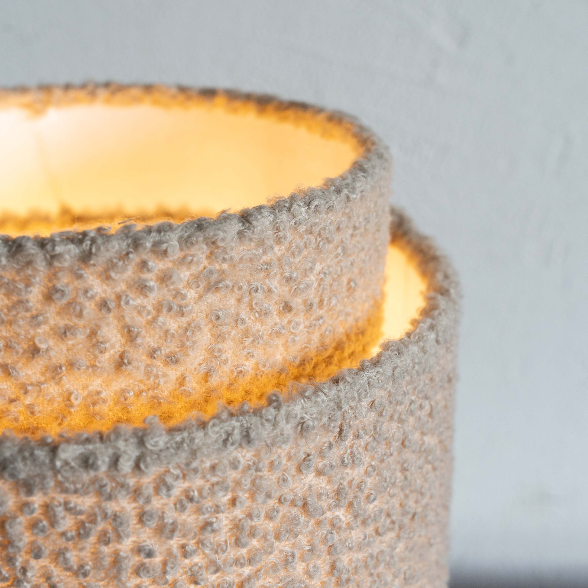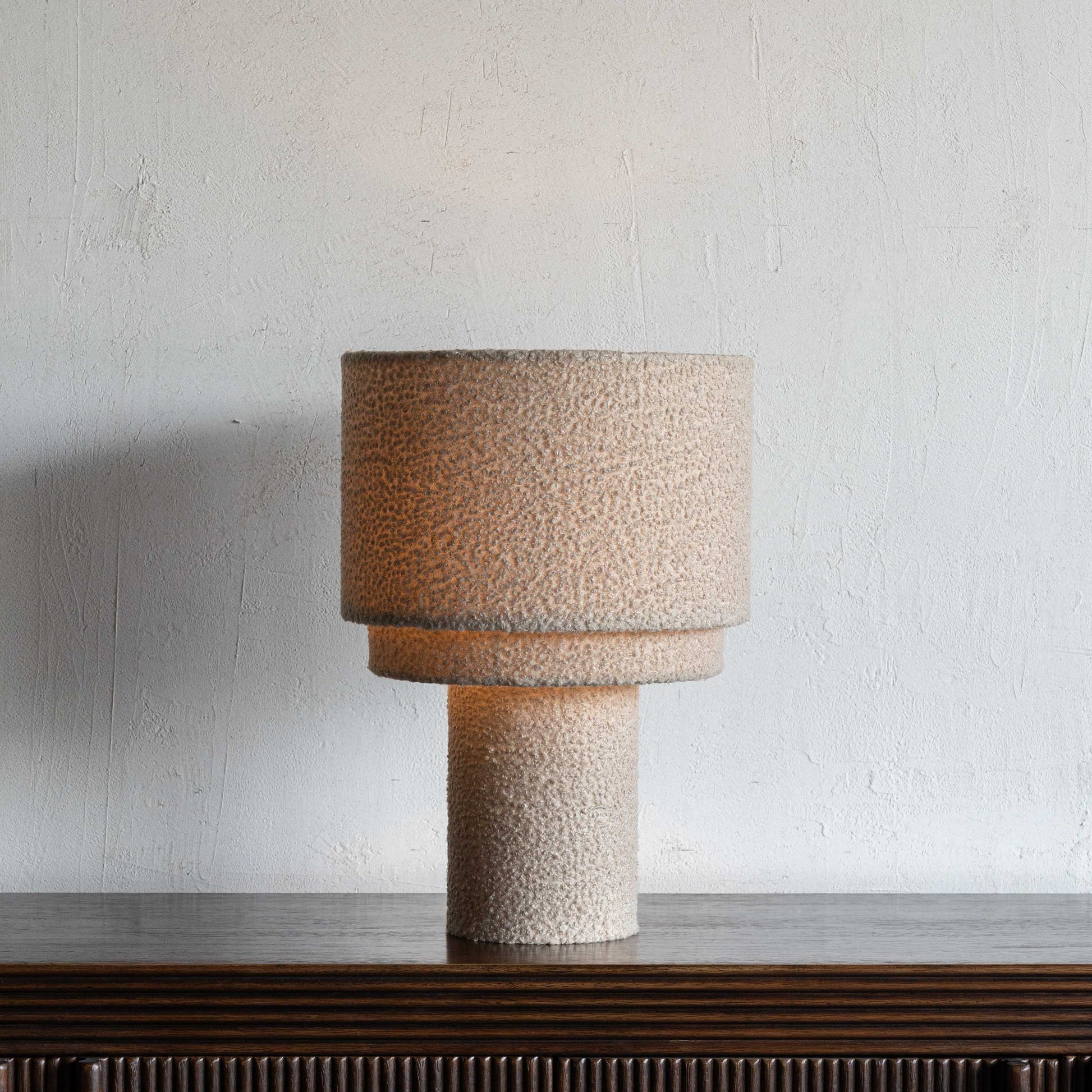 The Winifred Table Lamp features a soft boucle fabric shade with feather-like texture. Its sculptural shape and gentle glow create a calming, cozy presence in any room.